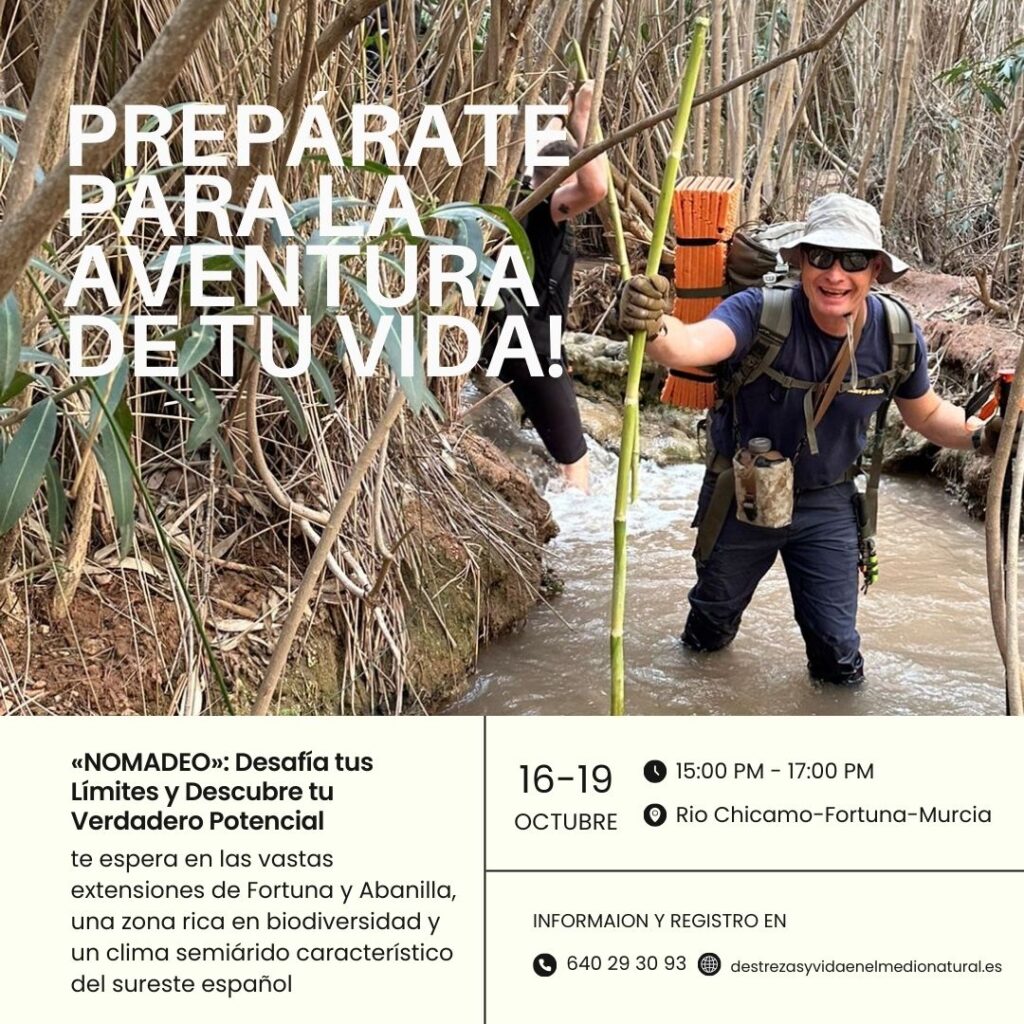 En este curso intensivo, no solo aprenderá a sobrevivir, sino a vivir plenamente en armonía con el medio natural. La experiencia NOMADEO es una oportunidad única para poner a prueba su resistencia física y mental mientras se sumerge en la milenaria geología y el singular ecosistema de la «Palestina Murciana».