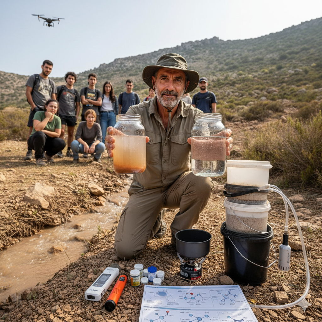- Práctica HANDS-ON. No es teoría de aula. Saldremos al campo para que aprendas a potabilizar agua de ríos, lluvia o charcos mediante una formación experiencial «sucia» en el terreno.