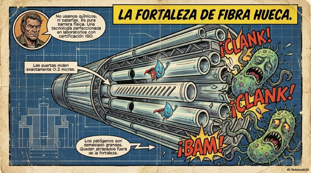 🛡️ Protección de alto nivel en tu mochila: El corazón de LifeStraw es su membrana de fibra hueca con poros de 0.2 micras. Este sistema actúa como un tamiz microscópico que atrapa físicamente los contaminantes sin necesidad de químicos o baterías. ✅ Elimina el 99.999999% de las bacterias (como E. coli y Salmonela). ✅ Elimina el 99.999% de los parásitos (Giardia y Cryptosporidium). ✅ Elimina el 99.999% de los microplásticos y reduce la turbidez (arena y lodo).