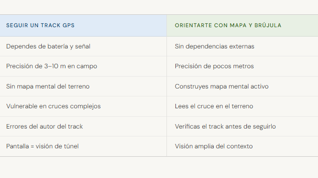 Esta es la distinción que lo cambia todo y que ninguna app tiene incentivo en explicarte. Cuando sigues un track en pantalla, tu cerebro opera en modo pasivo: delega la tarea de orientación al dispositivo. No construyes ningún mapa mental del terreno, no asocias accidentes geográficos con su representación cartográfica, no desarrollas el sentido de dirección que viene de observar activamente el entorno.